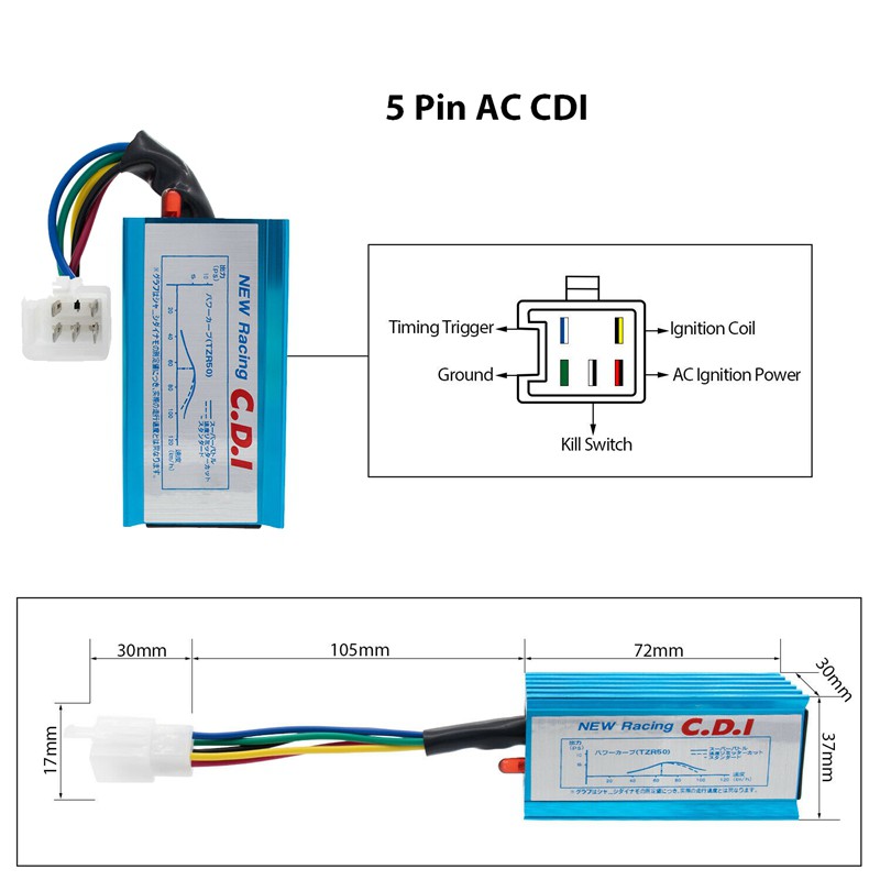 The reseller does not have a wiring diagram for it, referring me to. 5 pin cdi box with a pigtail and using a wiring diagram to splice them together. What is the difference between a 5 pin and a 6 pin cdi. The picture below shows the most common set of components and how they connect together. Electricity does not know color look at the cdi box and follow the wire .